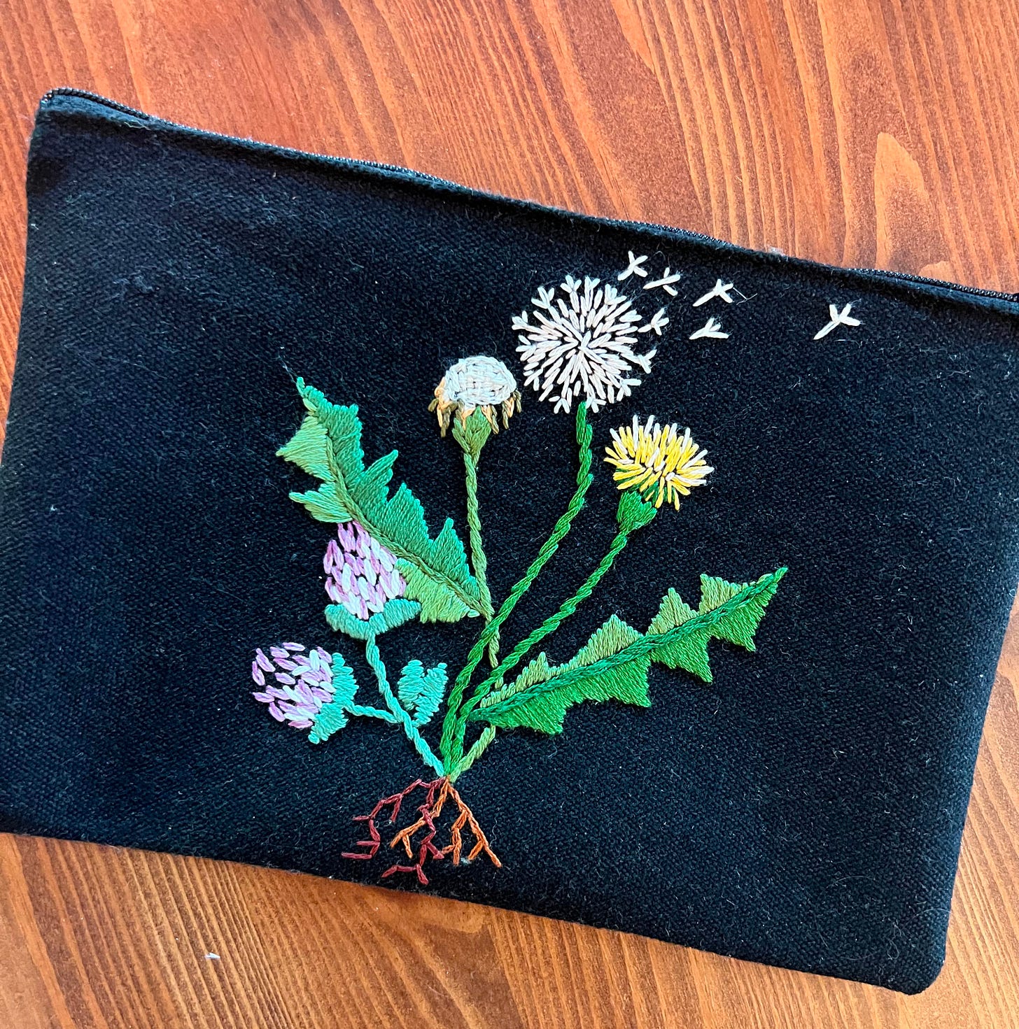 The essay in The Rumpus is about this project I cooked up in which I used embroidery to write, but without using language at all. A bit esoteric, but I was really into it. At the same time I was sewing a series of little pouches to give as gifts. They did not feature expert-level sewing, but I loved making them. And they were easier to interpret than my embroidered “sentences”—though they still did some kind of storytelling. I thought this dandelion one in particular had a narrative: